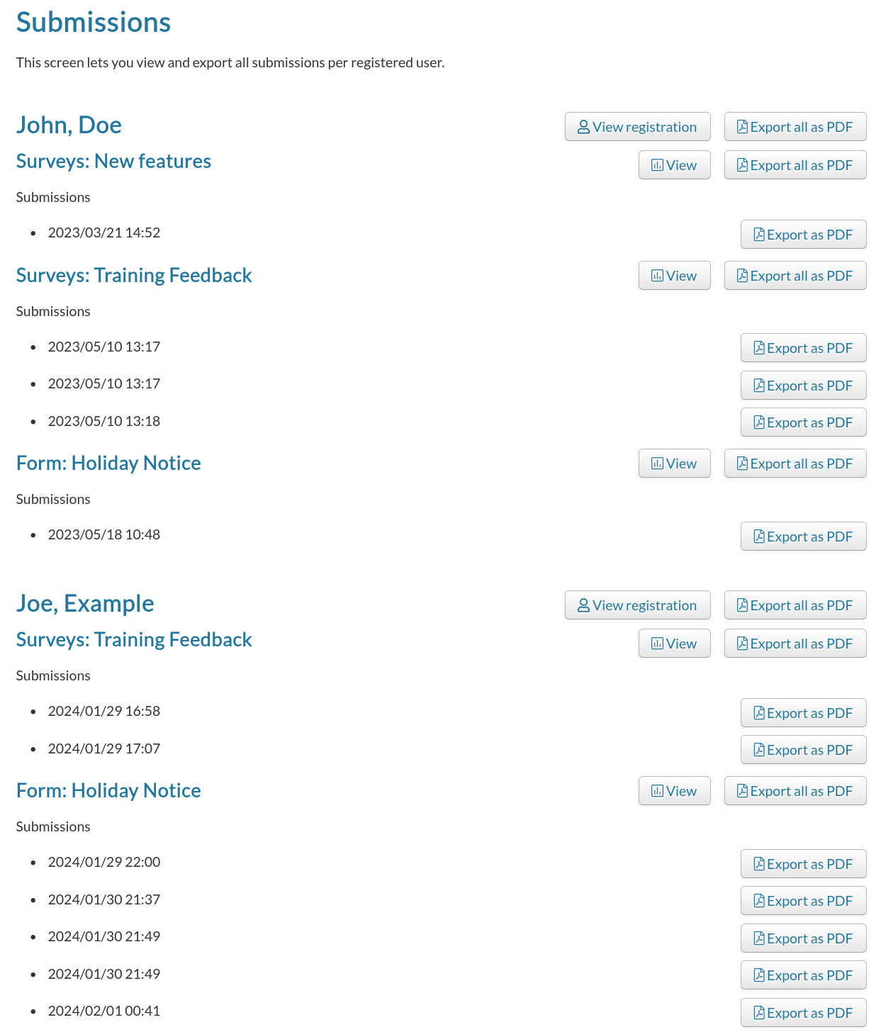 You can view all form/survey submissions by users, on the Submissions screen. In the menu above, click 'More' then 'Submissions'.